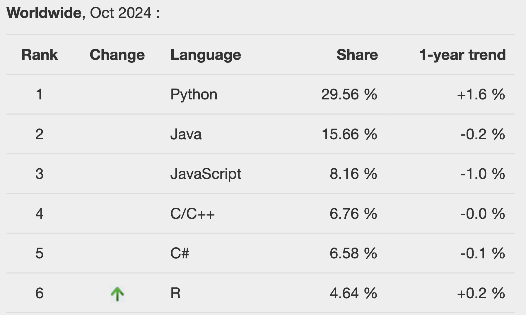 R ?R est très flexible et puissant—adaptable à presque n’importe quelle tâche (nettoyage de données, visualisation de données, économétrie, analyse de données spatiales, apprentissage automatique, web scraping, etc.)R est open source et gratuit - permettant à vous et à votre institution d’économiser de l’argent !R connaît une croissance rapide en popularité.