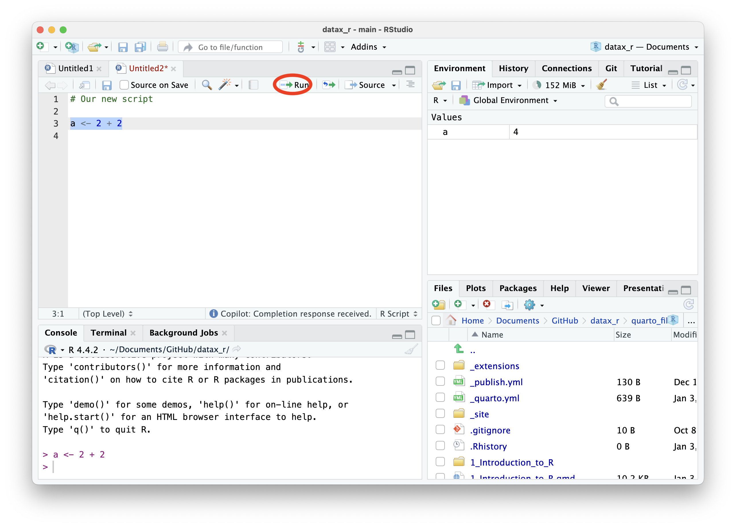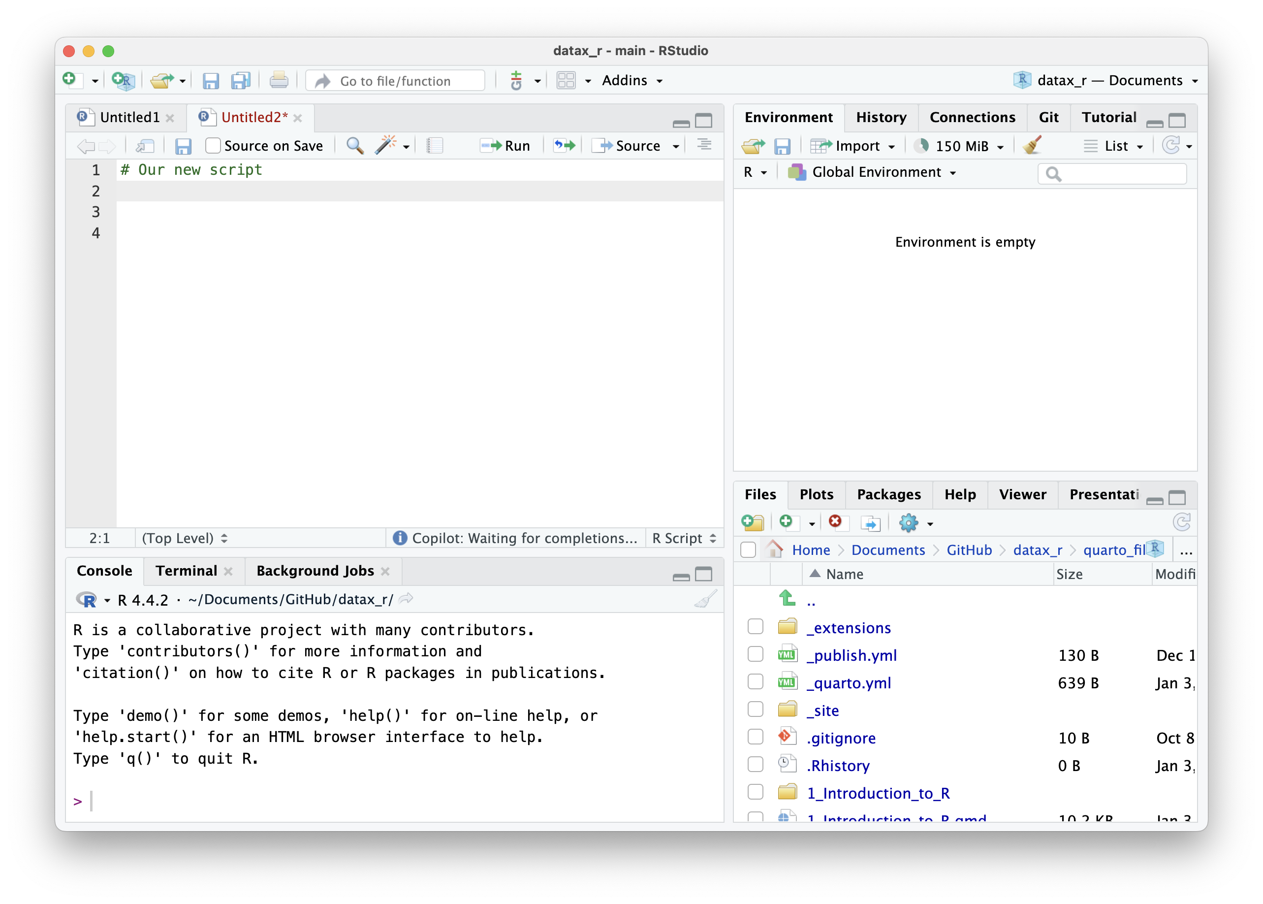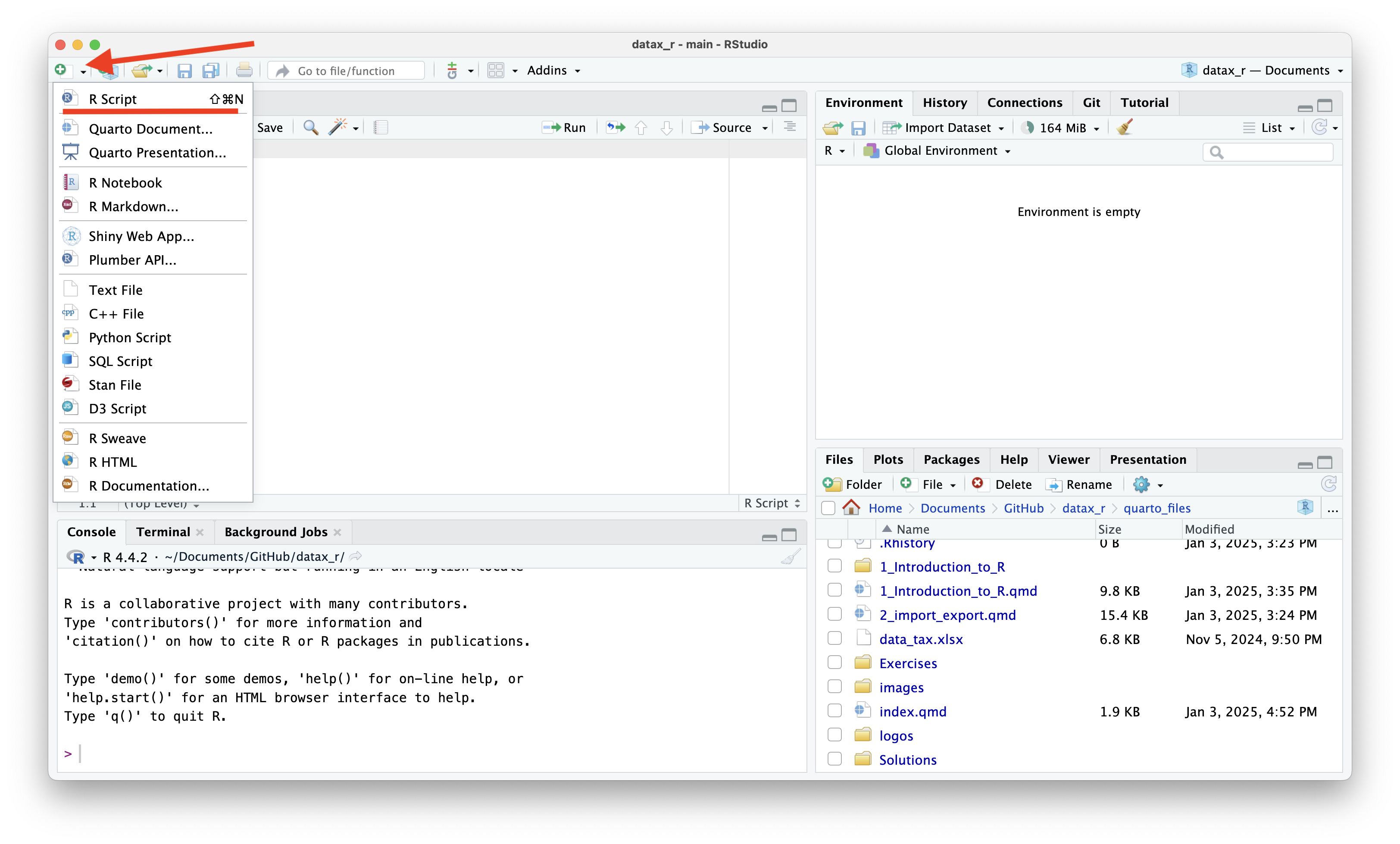 Vous pouvez utiliser la barre de menu ou Ctrl + Shift + N pour créer de nouveaux scripts R.