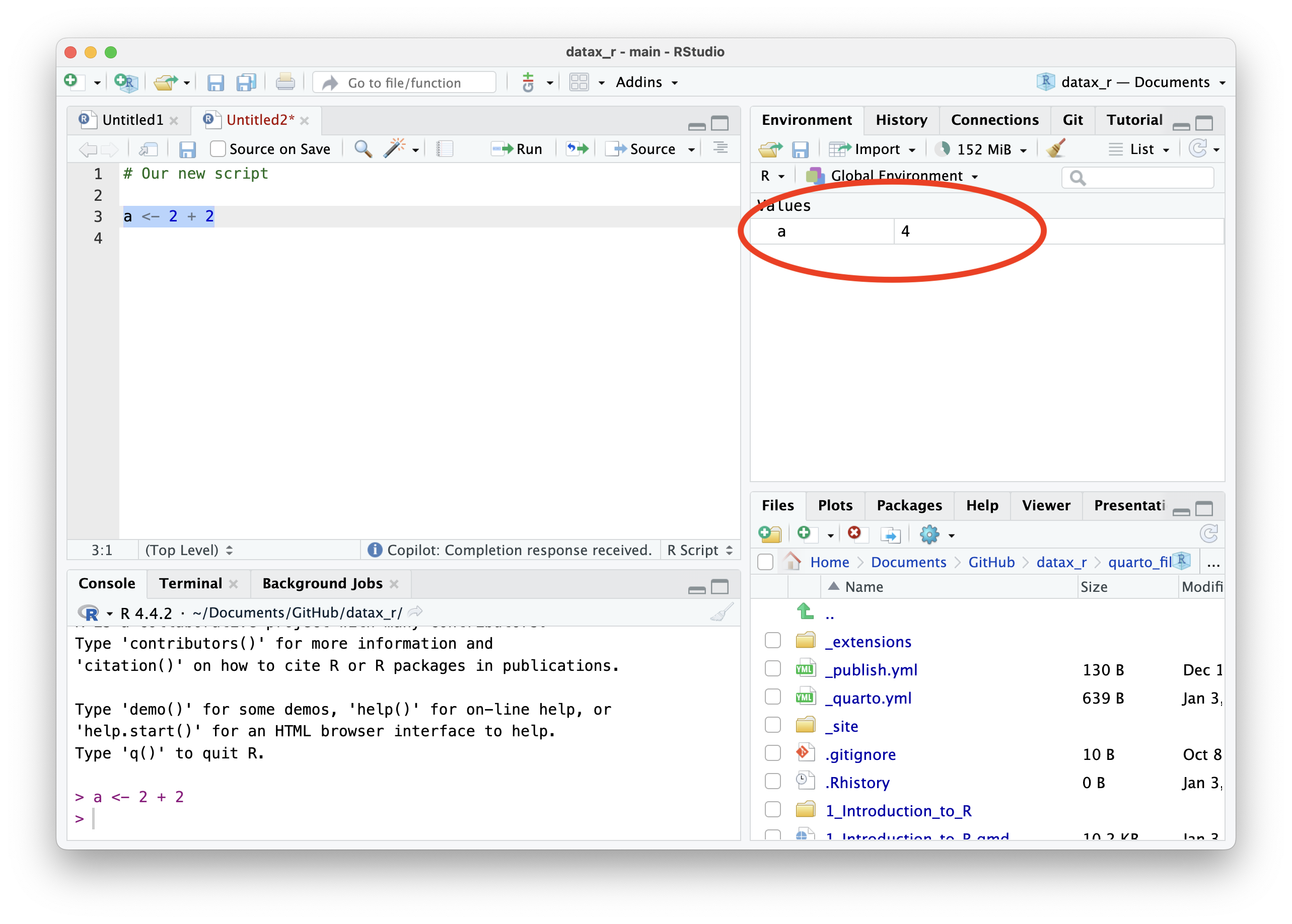 Pour exécuter une commande, écrivez-la dans le panneau Source et appuyez sur Ctrl+Enter (Windows) pour l’exécuter dans la Console.