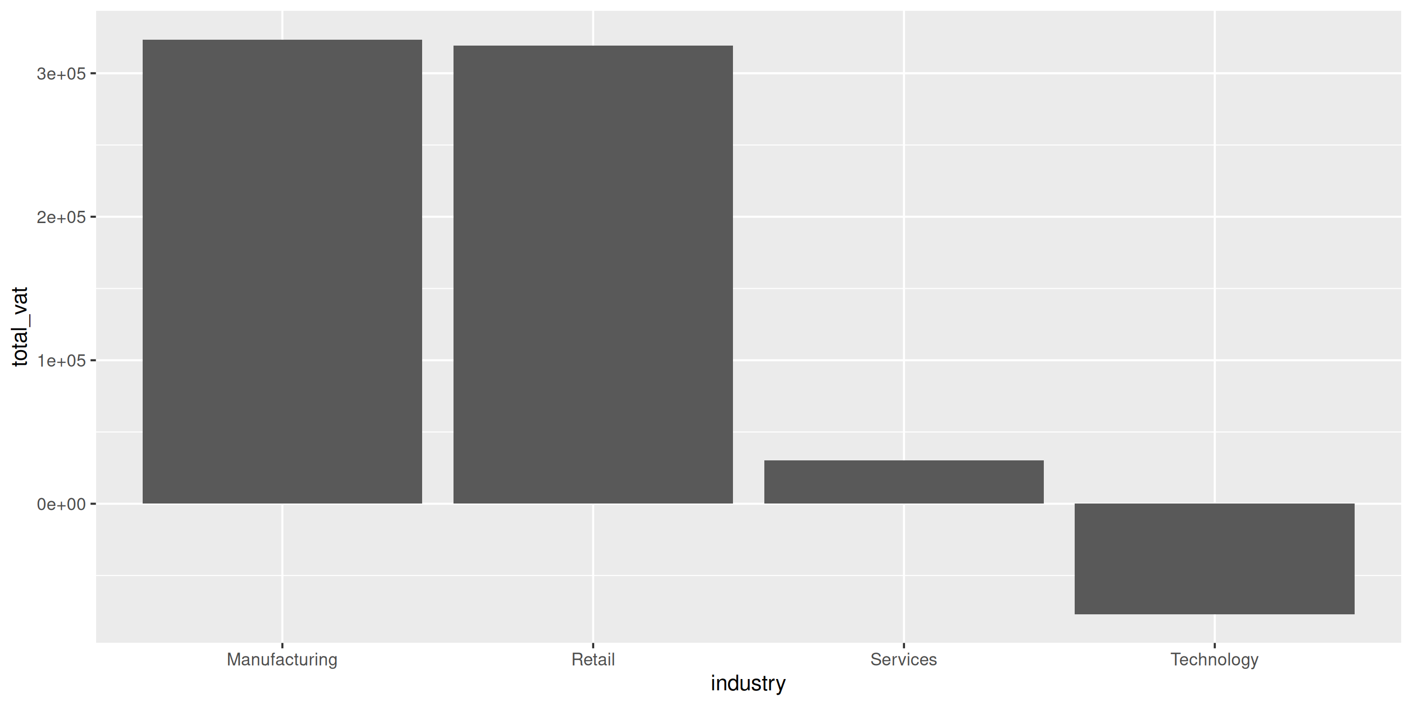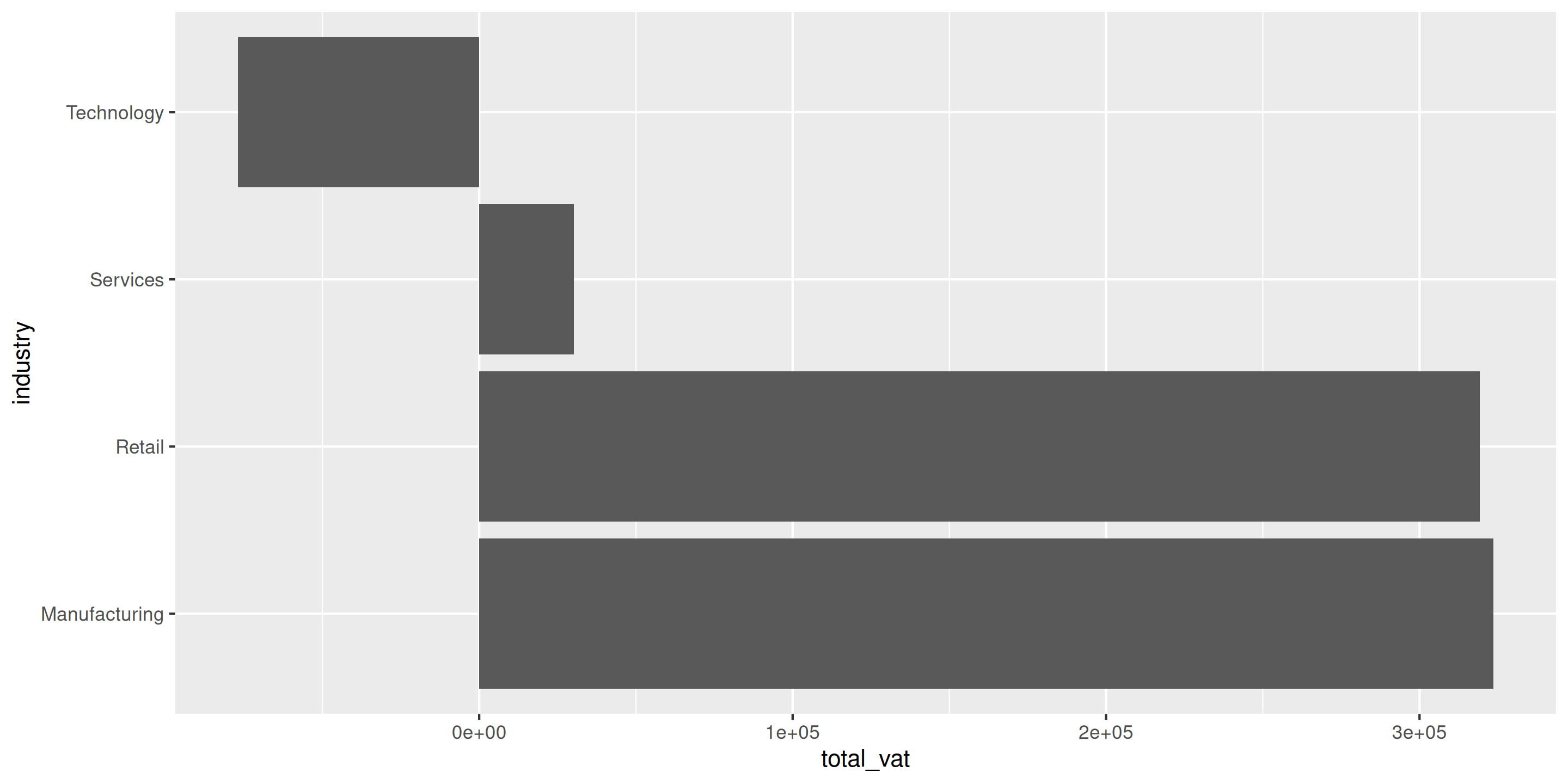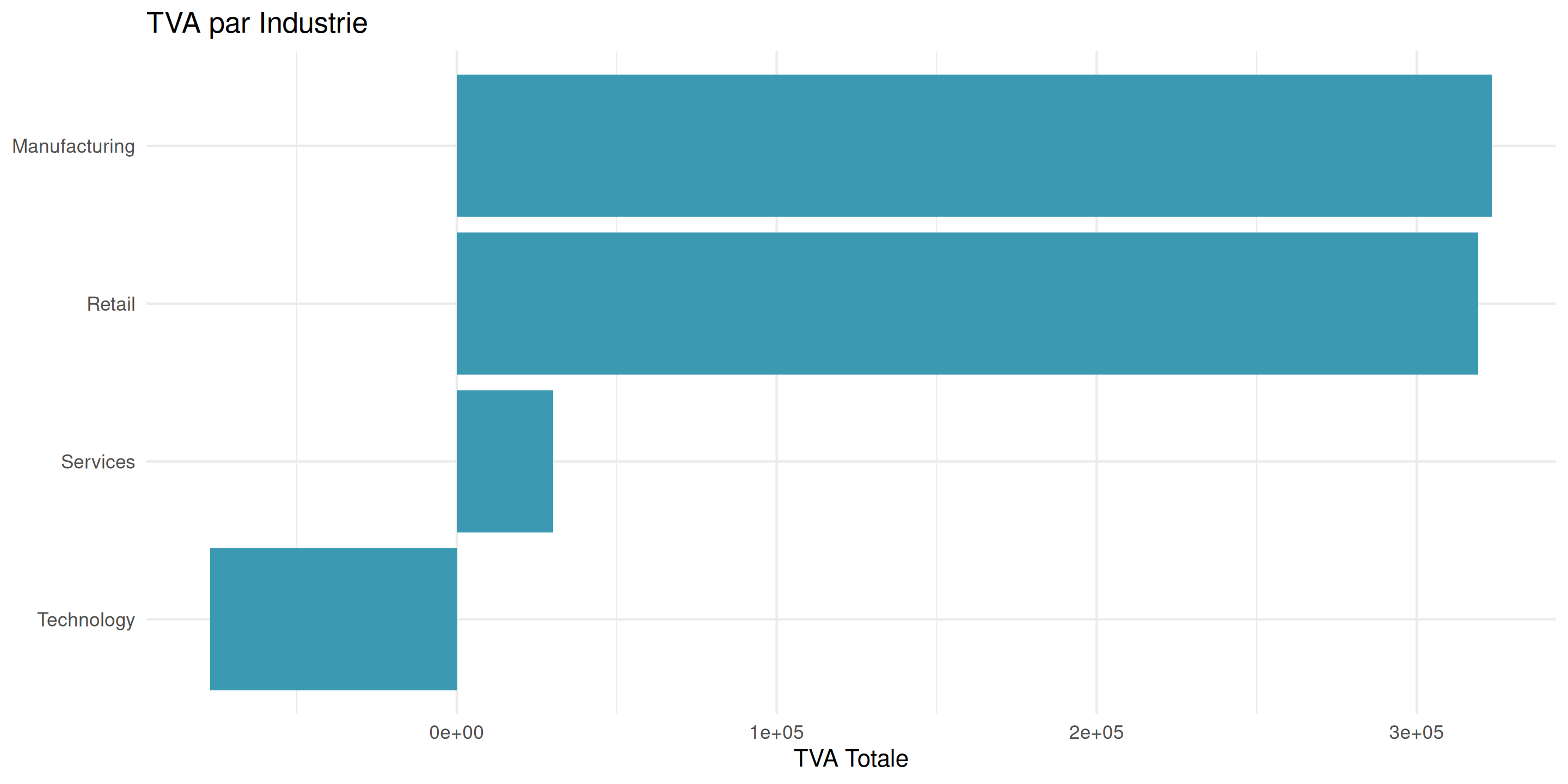 actual_vat par industry ET firm_sizeindustry sur l’axe des x, total_vat sur l’axe des yfill = firm_size pour colorer les barres par taille d’entrepriseposition = "dodge" pour placer les barres côte à côtecoord_flip()theme_minimal()Question : Quelle combinaison (industrie + taille d’entreprise) collecte le plus de TVA ?