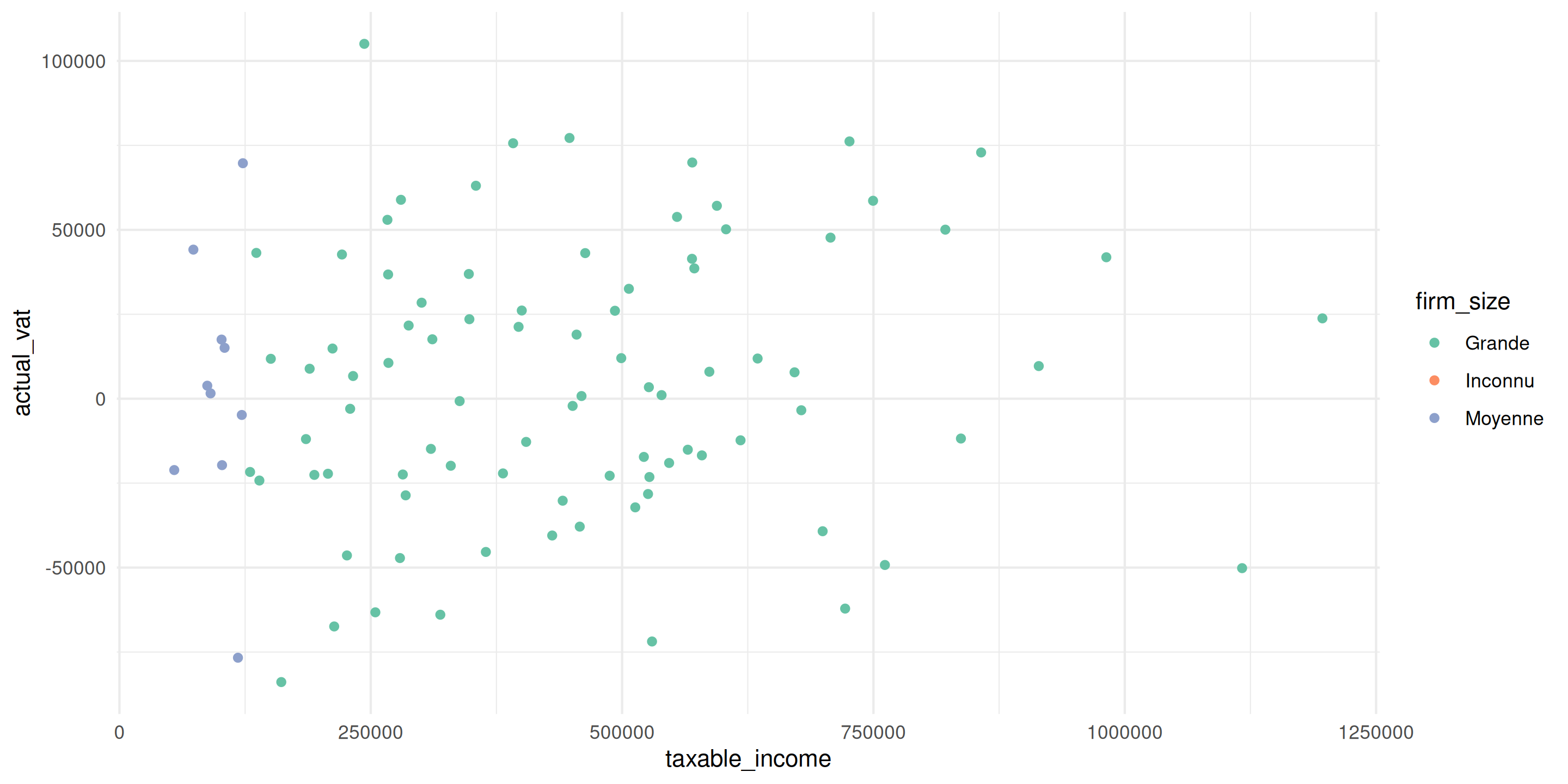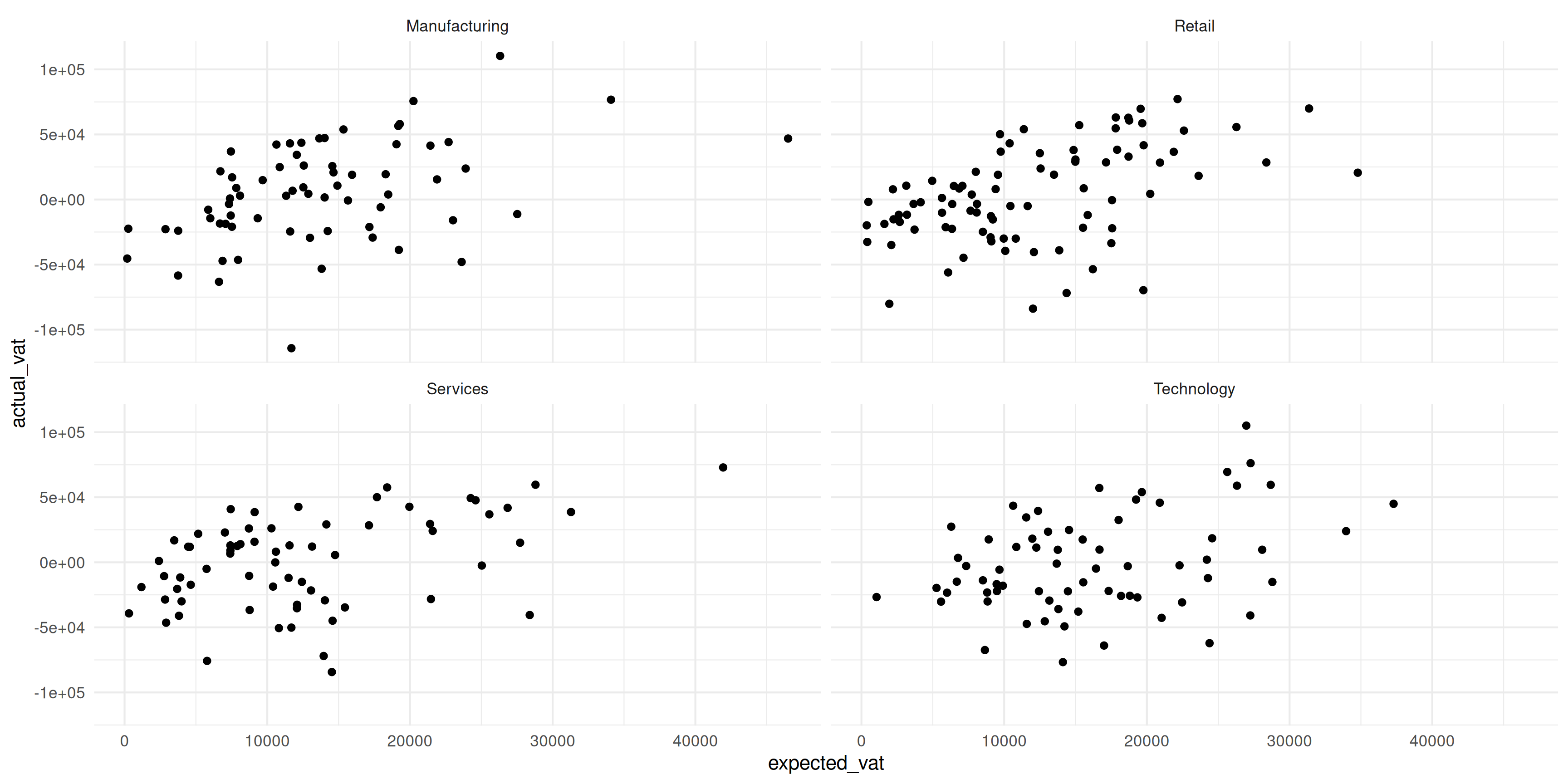 taxable_income vs actual_vatgeom_point()facet_wrap(~ industry)geom_smooth(method = "lm")Toujours inclure :