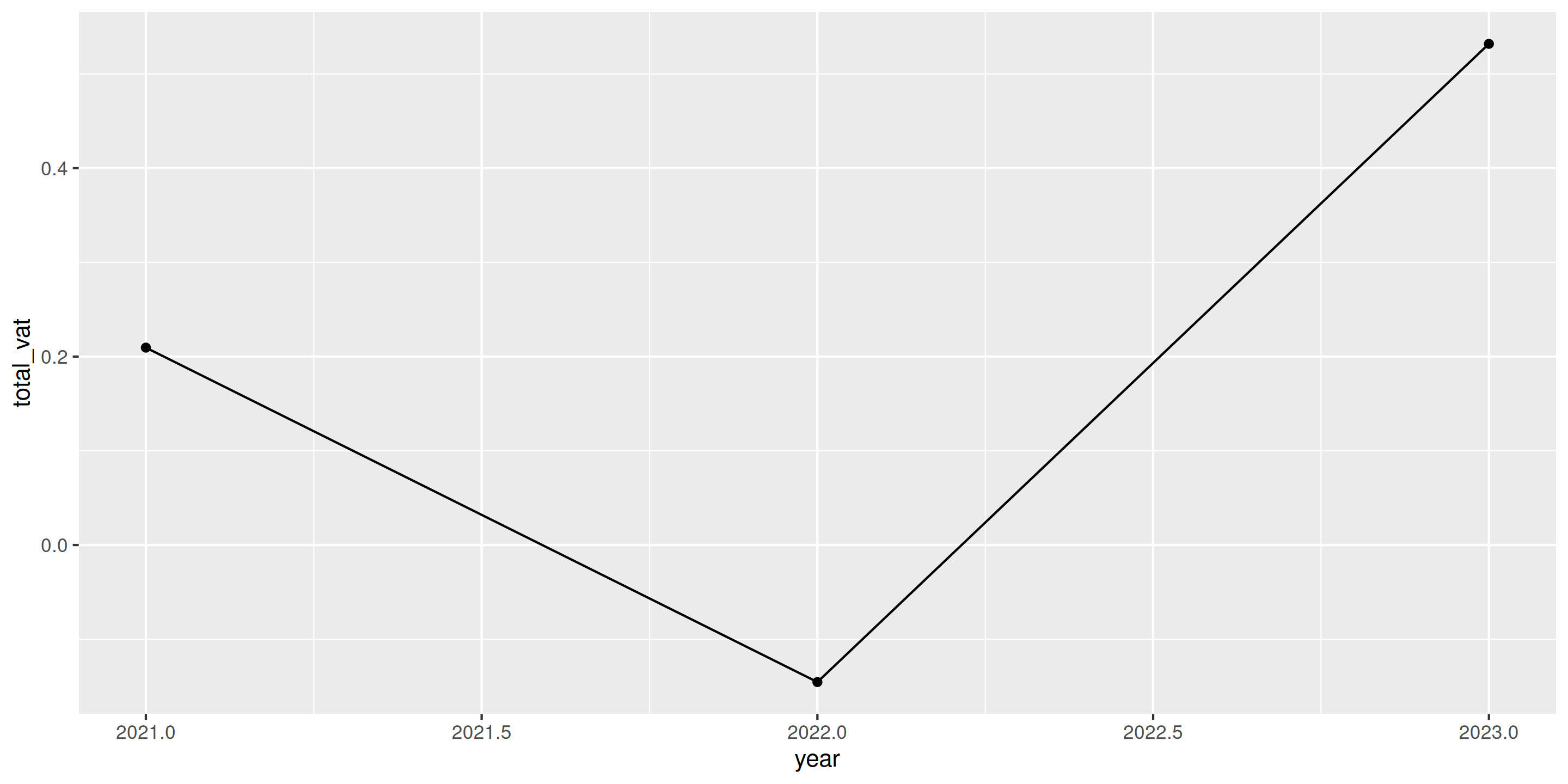vat_gap par yeargeom_line() et geom_point()year à l’axe des x, écart moyen à l’axe des ytheme_minimal()Question : L’écart de TVA augmente-t-il ou diminue-t-il ?
